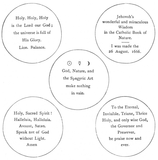 he spoke so learnedly about the Universal Medicine. In reply, he modestly disclaimed my insinuation, and described himself as a brassfounder, who had always taken a great interest in the extraction of medicinal potions from metals by means of fire. After some further conversation; the Artist Elias (for it was he) thus addressed me: "Since you have read so much in the works of the Alchemists about this Stone, its substance, its colour, and its wonderful effects, may I be allowed the question, whether you have not yourself prepared it?" On my answering his question in the negative, he took out of his bag a cunningly-worked ivory box, in which there were three large pieces of a substance resembling glass, or pale sulphur, and informed me that here was enough of the Tincture for the production of 20 tons of gold. When I had held the precious treasure in my hand for a quarter of an hour (during which time I listened to a recital of its wonderful curative properties), I was compelled to restore it to its owner, which I could not help doing with a certain degree of reluctance. After thanking him for his kindness in showing it to me, I then asked how it was that his Stone did not display that ruby colour which I had been taught to regard as characteristic of the Philosopher's Stone. He replied that the colour made no difference, and that the substance was sufficiently mature for all practical purposes. My request that he would give me a piece of his Stone (though it were no larger than a coriander seed), he somewhat brusquely refused, adding, in a milder tone, that he could not give it me for all the wealth I possessed, and that not on account of its great preciousness, but for some other reason which it was not lawful for him to divulge; nay, if fire could be destroyed in that way, he would immediately throw it all into the fire. Then, after a moment's consideration, he enquired whether I could not shew him into a room at the back of the house, where we should be less liable to the observation of passers-by. On my conducting him into the state parlour (which he entered without wiping his dirty boots), he demanded of me a gold coin, and while I was looking for it, he produced from his breast pocket a green silk handkerchief, in which were folded up five medals, the gold of which was infinitely superior to that of my gold piece. On the medals appeared the following inscriptions:—
