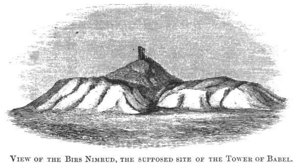 which is supposed to represent the Tower of Babel. Birs Nimrud now consists of seven stages, but the top stages were only built by Nebuchadnezzar; before his time it probably presented the appearance shown in the Assyrian sculpture, and in the similar Babylonian representation figured opposite page 236 of "Assyrian Discoveries."