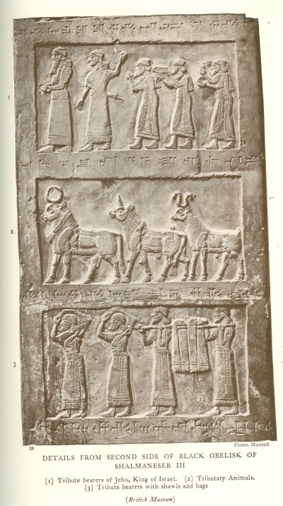 (1) Tribute bearers of Jehu, King of Israel. (2) Tributary Animals. (3) Tribute bearers with shawls and bags