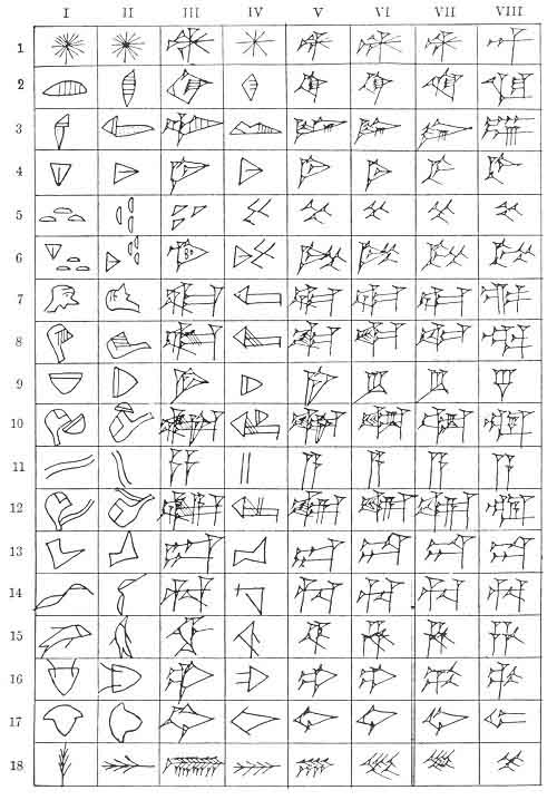The cuneiform script began as pictographic writing; each sign was a picture of one or more concrete objects and represented a word whose meaning was identical with, or closely related to, the object pictured. The defects of a system of this type are obvious; the complicated form of the signs and the huge number of signs required, render it too unwieldy for practical use. The Sumerian scribes overcame the first difficulty by gradually simplifying and conventionalizing the form of the signs until their pictographic origin was no longer apparent. As for the second difficulty, they reduced the number of signs and kept it within effective limits by resorting to various helpful devices. The most significant of these consisted of Substituting phonetic for ideographic values. The table on the opposite page was prepared for the purpose of illustrating this two-fold development in the course of the centuries; a detailed description will be found in note 18.
