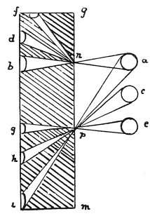 The images of objects are all diffused through the atmosphere which receives them; and all on every side in it. To prove this, let a c e be objects of which the images are admitted to a dark chamber by the small holes n p and thrown upon the plane f i opposite to these holes. As many images will be produced in the chamber on the plane as the number of the said holes.