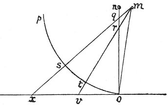 The object that is nearest to the eye always seems larger than another of the same size at greater distance. The eye m, seeing the spaces o v x, hardly detects the difference between them, and the. reason of this is that it is close to them 46 ; but if these spaces are marked on the vertical plane n o the space o v will be seen at o r, and in the same way the space v x will appear at r q. And if you carry this out in any place where you can walk round, it will look out of proportion by reason of the great difference in the spaces o r and r q. And this proceeds from the eye being so much below [near] the plane that the plane is foreshortened. Hence, if you wanted to carry it out, you would have [to arrange] to see the perspective through a single hole which must be at the point m, or else you must go to a distance of at least 3 times the height of the object you see. The plane o p being always equally remote from the eye will reproduce the objects in a satisfactory way, so that they may be seen from place to place.