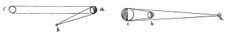 As regards all visible objects 3 things must be considered. These are the position of the eye which sees: that of the object seen [with regard] to the light, and the position of the light which illuminates the object, b is the eye, a the object seen, c the light, a is the eye, b the illuminating body, c is the illuminated object.