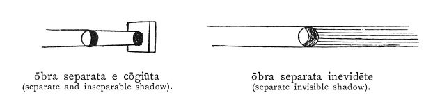 An inseparable shadow is that which is never absent from the illuminated body. As, for instance a ball, which so long as it is in the light always has one side in shadow which never leaves it for any movement or change of position in the ball. A separate shadow may be and may not be produced by the body itself. Suppose the ball to be one braccia distant from a wall with a light on the opposite side of it; this light will throw upon the wall exactly as broad a shadow as is to be seen on the side of the ball that is turned towards the wall. That portion of the cast shadow will not be visible when the light is below the ball and the shadow is thrown up towards the sky and finding no obstruction on its way is lost.