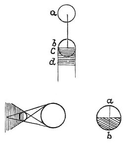The relations of luminous to illuminated bodies.The middle of the light and shade on an object in light and shade is opposite to the middle of the primary light. All light and shadow expresses itself in pyramidal lines. The middle of the shadow on any object must necessarily be opposite the middle of its light, with a direct line passing through the centre of the body. The middle of the light will be at a, that of the shadow at b. [Again, in bodies shown in light and shade the middle of each must coincide with the centre of the body, and a straight line will pass through both and through that centre.]