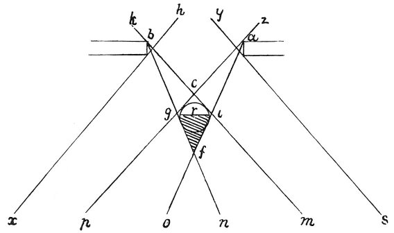 Every body in light and shade is situated between 2 pyramids one dark and the other luminous, one is visible the other is not. But this only happens when the light enters by a window. Supposing a b to be the window and r the body in light and shade, the light to the right hand z will pass the object to the left and go on to p; the light to the left at k will pass to the right of the object at i and