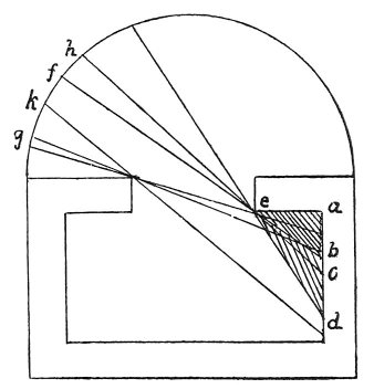 g and is illuminated by it. c d faces the sky at h k. c d, being exposed to a larger extent of sky than b c, it is reasonable that it should be more lighted. And thus, up to a certain distance, the wall a d will grow lighter for the reasons here given, until the darkness of the room overpowers the light from the window.