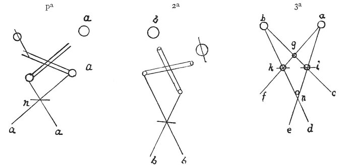 forms a compound shadow and not a simple one, as happens with other intersections of compound shadows. This occurs, according to the 2nd [diagram] of this [prop.] which says:--The intersection of derived shadows when produced by the intersection of columnar shadows caused by a single light does not produce a simple shadow. And this is the corollary of the 1st [prop.] which says:--The intersection of simple derived shadows never results in a deeper shadow, because the deepest shadows all added together cannot be darker than one by itself. Since, if many deepest shadows increased in depth by their duplication, they could not be called the deepest shadows, but only part-shadows. But if such intersections are illuminated by a second light placed between the eye and the intersecting bodies, then those shadows would become compound shadows and be uniformly dark just as much at the intersection as throughout the rest. In the 1st and 2nd above, the intersections i k will not be doubled in depth as it is doubled in quantity. But in this 3rd, at the intersections g n they will be double in depth and in quantity.