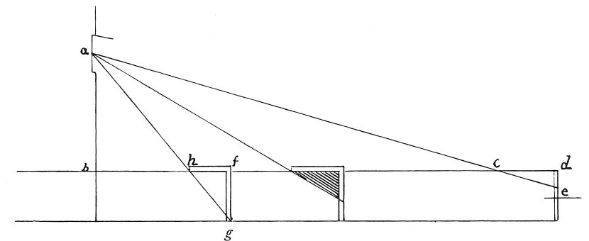 The shadow cast by an object on a plane will be smaller in proportion as that object is lighted by feebler rays. Let d e be the object and d c the plane surface; the number of times that d e will go into f g gives the proportion of light at f h to d c. The ray of light will be weaker in proportion to its distance from the hole through which it falls.