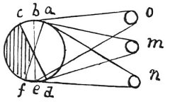 The surface of a body assumes in some degree the hue of those around it. The colours of illuminated objects are reflected from the surfaces of one to the other in various spots, according to the various positions of those objects. Let o be a blue object in full light, facing all by itself the space b c on the white sphere a b e d e f, and it will give it a blue tinge, m is a yellow body reflected onto the space a b at the same time as o the blue body, and they give it a green colour (by the 2nd [proposition] of this which shows that blue and yellow make a beautiful green &c) And the rest will be set forth in the Book on Painting. In that Book it will be shown, that, by transmitting the images of objects and the colours of bodies illuminated by sunlight through a small round perforation and into a dark chamber onto a plane surface, which itself is quite white, &c