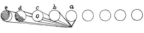 That part of a tree will show the fewest spaces, behind which a large number of trees are standing between the tree and the air [sky]; thus in the tree a the spaces are not concealed nor in b, as there is no tree behind. But in c only half shows the spaces filled up by the tree d, and part of the tree d is filled up by the tree e and a little farther on all the spaces in the mass of the trees are lost, and only that at the side remains.