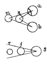 with only one eye; and the reason is that two eyes see one object behind another as a and b see m and n. m cannot exactly occupy [the space of] n because the base of the visual lines is so broad that the second body is seen beyond the first. But if you close one eye, as at s the body f will conceal r, because the line of sight proceeds from a single point and makes its base in the first body, whence the second, of the same size, can never be seen.