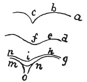 The hollow spaces interposed between the muscles must not be of such a character as that the skin should seem to cover two sticks laid side by side like c, nor should they seem like two sticks somewhat remote from such contact so that the skin hangs in an empty loose curve as at f; but it should be like i, laid over the spongy fat that lies in the angles as the angle n m o; which angle is formed by the contact of the ends of the muscles and as the skin cannot fold down into such an angle, nature has filled up such angles with a small quantity of spongy and, as I may say, vesicular fat, with minute bladders [in it] full of air, which is condensed or rarefied in them according to the increase or the diminution of the substance of the muscles; in which latter case the concavity i always has a larger curve than the muscle.