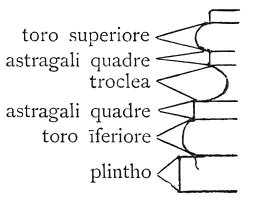 72:393 : No explanation can be offered of the meaning of the letter B, which precedes each name. It may be meant for basa (base). Perhaps it refers to some author on architecture or an architect (Bramante?) who employed the designations, thus marked for the mouldings. 3. troclea. Philander: Trochlea sive trochalia aut rechanum. 6. Laterculus or latastrum is the Latin name for Plinthus (pi lambda Xiv) but Vitruvius adopted this Greek name and "latastro" seems to have been little in use. It is to be found besides the text given above, as far as I am aware, only two drawings of the Uffizi Collection, where in one instance, it indicates the abacus of a Doric capital.