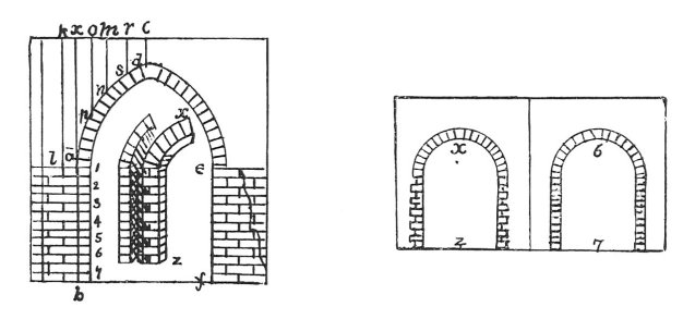 This wall will break under the arch e f, because the seven whole square bricks are not sufficient to sustain the spring of the arch placed on them. And these seven bricks will give way in their middle exactly as appears in a b. The reason is, that the brick a has above it only the weight a k, whilst the last brick under the arch has above it the weight c d x a.