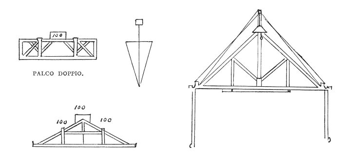98:406 : The three smaller sketches accompany the text in the original, but the larger one is not directly connected with it. It is to be found on fol. 89a of the same Manuscript and there we read in a note, written underneath, coverchio della perdicha del castello (roof of the flagstaff of the castle),--Compare also Pl. XCIII, No. 1.