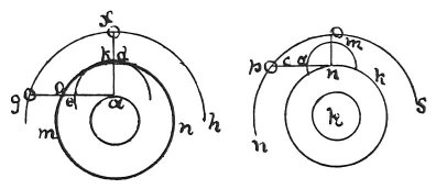 First describe the eye; then show how the twinkling of a star is really in the eye and why one star should twinkle more than another, and how the rays from the stars originate in the eye; and add, that if the twinkling of the stars were really in the stars --as it seems to be--that this twinkling appears to be an extension as great as the diameter of the body of the star; therefore, the star being larger than the earth, this motion effected in an instant would be a rapid doubling of the size of the star. Then prove that the surface of the air where it lies contiguous to fire, and the surface of the fire where it ends are those into which the solar rays penetrate, and transmit the images of the heavenly bodies, large when they rise, and small, when they are on the meridian. Let a be the earth and n d m the surface of the air in contact with the sphere of fire; h f g is the orbit of the moon or, if you please, of the sun; then I say that when the sun appears on the horizon g, its rays are seen passing through the surface of the air at a slanting angle, that is o m; this is not the case at d k. And so it passes through a greater mass of air; all of e m is a denser atmosphere.