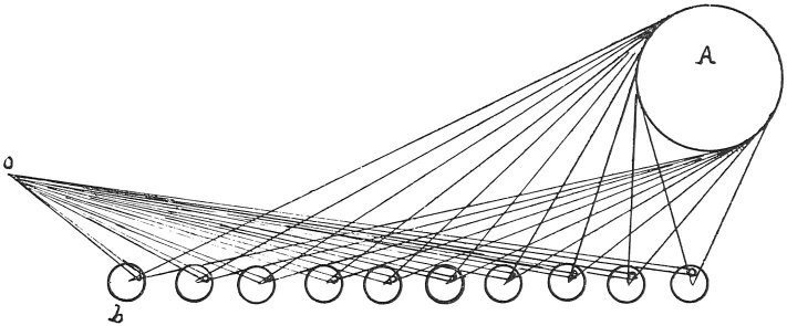 This diagram, of several spherical bodies interposed between the eye and the sun, is given to show that, just as the reflection of the sun is seen in each of these bodies, in the same way that image may be seen in each curve of the waves of the sea; and as in these many spheres many reflections of the sun are seen, so in many waves there are many images, each of which at a great distance is much magnified to the eye. And, as this happens with each wave, the spaces