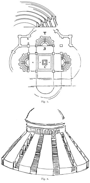 MS. B, 55a (see page 56, Fig. 1). A domed church after the type of Pl. XCV, No. 1, shows four theatres occupying the apses and facing the square "coro" (choir), which is in the centre between the four pillars of the dome. 381 The rising arrangement of the seats is shown in the sketch above. At the place marked B Leonardo wrote teatri per uldire messa (rows of seats to hear mass), at T teatri, and at C coro (choir).