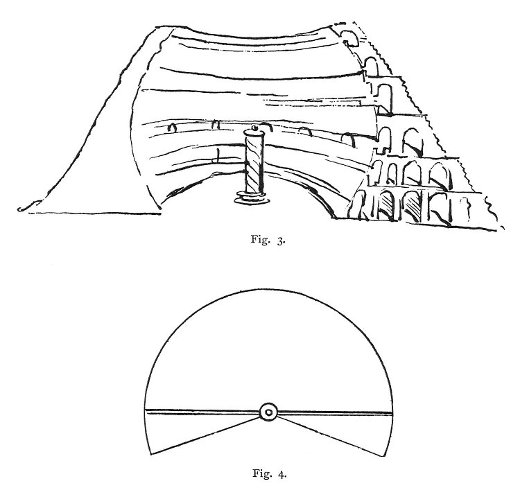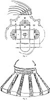 In MS. Ash II, 8a (see p. 56 and 57. Fig. 2 and 3). "Locho dove si predica" (Place for preaching). A most singular plan for a building. The interior is a portion of a sphere, the centre of which is the summit of a column destined to serve as the preacher's pulpit. The inside is somewhat