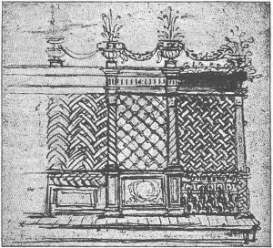 There are few data by which to judge of Leonardo's style in the treatment of detail. On Pl. LXXXV No. 10 and Pl. CIII No. 3, we find some details of pillars; on Pl. CI No. 3 slender pillars designed for a fountain and on Pl. CIII No. 1 MS. B, is a pen and ink drawing of a vase which also seems intended for a fountain. Three handles seem to have been intended to connect the upper parts with the base. There can be no doubt that Leonardo, like Bramante, but unlike Michael Angelo, brought infinite delicacy of motive and execution to bear on the details of his work.