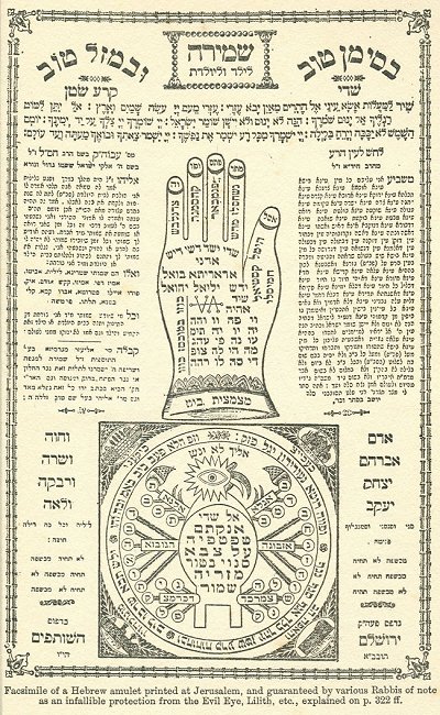 4. Besides written amulets like that of which a translation from the original Hebrew is given above, it is customary amongst Jews and other Orientals to wear different objects made of metal, glass, bone, etc., to keep away evil spirits, and ward off the effects of the evil eye. Amongst these objects we may mention, a wolf's bone, blue beads, and silver figures of a pair of frogs (the sex of each figure being clearly indicated), a sword, pistol, gun, battle-axe, pair of scissors, scimitar, a hand, tooth, etc., or to wear a sprig of rue, or a copy of the Koran, etc.
