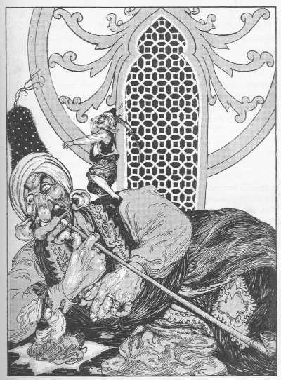 When the Arab took a few steps he perceived that the basin was unusually heavy. (The young man was, of course, rendered invisible through wearing the magic turban.) "What has happened to you, lady?" asked the Arab; "today you are so heavy that you nearly crush me."