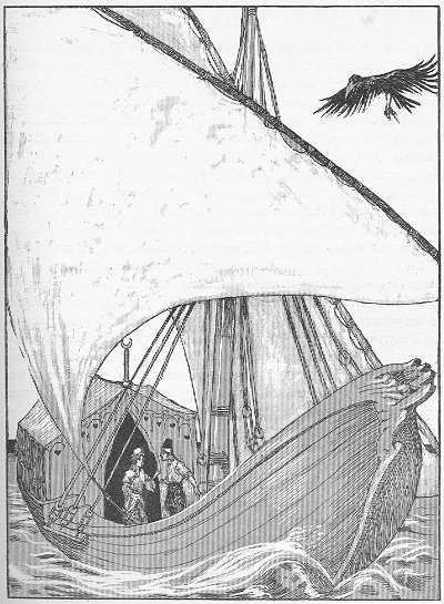 The youth went home and wept most bitterly; but the crow appeared and inquired why he sorrowed. The poor youth told his story. "That trifle is not worth so many tears," replied the crow. "Go immediately to the King and request a large ship, large enough to accommodate forty maidens, with a garden and also a very beautiful bath on board." The bird-catcher went to the Padishah and told him what was required for the voyage. The ship was built according to his wish. The youth went aboard, and while he was considering whether he should sail to the right or to the left, the crow once more appeared. "Sail always to the right," he instructed, "and stop not until you come to a high mountain. At the foot of this mountain dwell the forty peris. When they see your ship they will all desire to inspect it. However you must let only the queen come on board, for she is the owner of the little bird. While you are showing her the ship, set sail and stop not again until you have arrived home."