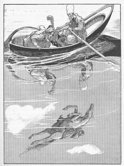 The Princess now cut off his head and stuck it in the ground, then opened his stomach and laid herself and her children in it. Here they fell fast asleep. When she awoke she saw that she was in a beautiful palace; one finer than either her father's or her husband's. She was lying in a lovely bed, and hardly had she risen when slaves appeared with water: one bathed her, others clothed her. The twins lay in a golden cradle, and nurses stood around them, soothing them with sweet songs. At dinnertime, gold and silver dishes appeared laden with delicious food. It was like a dream; but days and weeks passed away, weeks passed into months, and the months into a year, and still the dream--if dream it was--did not come to an end.