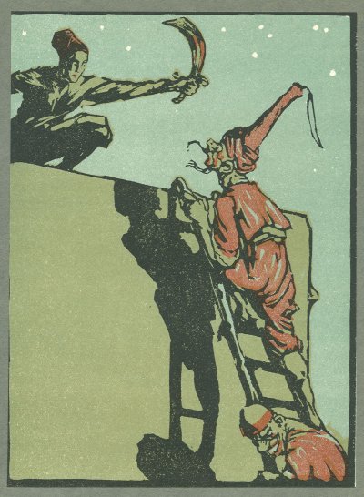 we have been unable to accomplish our purpose." After some investigation the young man discovered a place where he could scale the wall. He climbed up, and when he had reached the top he invited the others to follow him one by one. As they came up he cut off their heads and threw their bodies into the courtyard. When all the forty had been destroyed in this manner he entered the serai and began to wander through the halls and corridors.