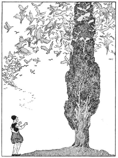 Thanking the dervish for his useful advice, the young man went his way until he arrived at the place indicated, where he sat down to rest under the tall cypress tree. He waited until all the birds in the world had alighted thereon, then said "Madjun!" and no bird was able to fly away. Collecting them, he returned home and