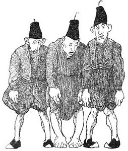 On and on we went, until we came to three houses, two of which were in ruins, while the third had no foundation. There lay three men, two dead and one without life. We asked the dead men to give us a vessel to cook our duck in. They showed us three cupboards, two of which were broken and the third had no sides. In them we found three plates, two full of holes and the third without bottom. In the plate with out bottom we cooked the duck. One of us said, "I have eaten sufficient;" the other, "I've no appetite," and I said, "No more, thank you." He who said he had eaten sufficient ate up