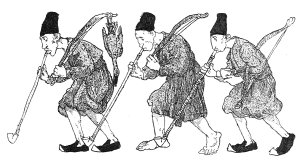 At this I went away in anger and came to a tree. Close by was a basket in which some one had put a murdered man. As I looked at him I saw forty thieves approaching; so I took to my heels, they after me. Running till I was out of breath I reached an old tumbledown djami, in the court of which I sat down to rest. The thieves followed and chased me round and round the court, until in my despair I sought to escape them by climbing to the pinnacle of the minaret. One of the thieves drew his knife and came at me, when with a loud shriek I loosed my hold and fell to earth.