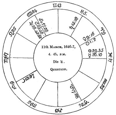 The querent was ♄ and ♂ exactly, had wit and volubility of tongue; and as ☿ and ☽ were in ☍, he under the earth, she in the 12th, he could never discover which of his neighbours it was that thus injured him; nor would he ask me. If he had, it must have been ♄, lord of the 12th, viz. some farmer or dealer in cattle, a sickly, repining character, living north-east, about fifteen furlongs, from him.