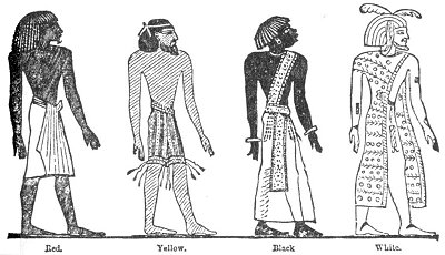 The ancient Egyptians were red men. They recognized four races of men--the red, yellow, black, and white men. They themselves belonged to the "Rot," or red men; the yellow men they called "Namu"--it included the Asiatic races; the black men were called "Nahsu," and the white men "Tamhu." The following figures are copied from Nott and Gliddon's "Types of Mankind," p. 85, and were taken by them from the great works of Belzoni, Champollion, and Lepsius.
