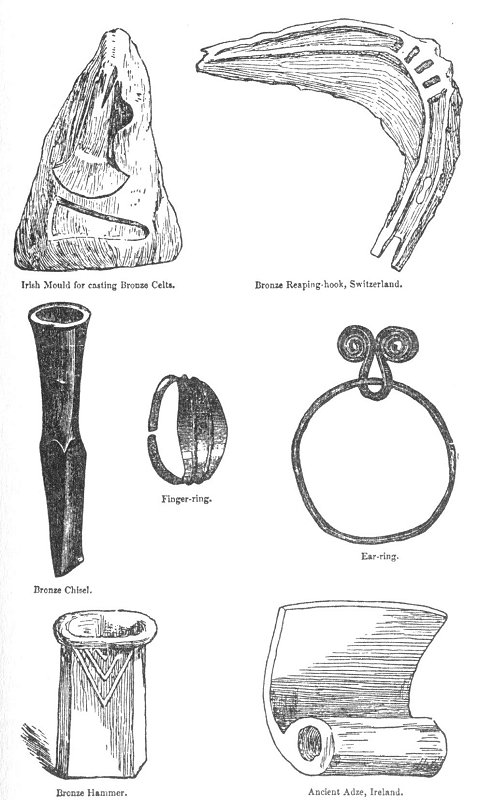 but by the beauty and variety of the articles made from it. We find not only, as before, during the Stone Age, axes, arrows, and knives, but, in addition, swords, lances, sickles, fish-hooks, ear-rings, bracelets, pins, rings, and a variety of other articles."