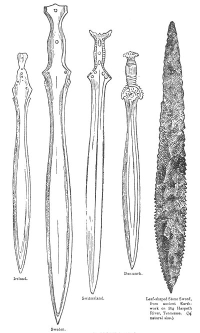 Compare the bronze swords in the four preceding illustrations-from Ireland, Sweden, Switzerland, and Denmark--and then observe the same very peculiar shape--the leaf-shape, as it is called--in the stone sword from Big Harpeth River, Tennessee.