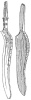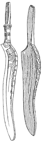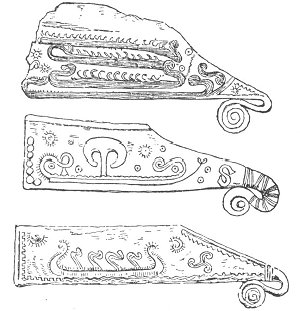 These knives were found in Denmark. The figures upon them represent ships, and it is not impossible that their curious appendages may have been a primitive kind of sails.