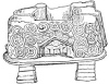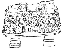 The museum at Munich contains a very interesting piece of pottery, which is supposed to represent one of the lake villages or hamlets of the era when the people of Switzerland dwelt in houses erected on piles driven into the bottom of the lakes of that country. The accompanying illustration represents it. The double spiral ornament upon it shows that it belongs to the Bronze Age.
