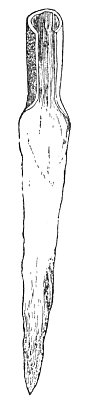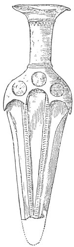 We give on page 258 a representation of a bronze dagger found in Ireland, a strongly-made weapon. The cut below it represents the only implement of the Bronze Age yet found containing an inscription. It has been impossible to decipher it, or even to tell to what group of languages its alphabet belongs.