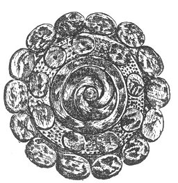 We find the double-spiral figure upon a shell ornament found on the breast of a skeleton, in a carefully constructed stone coffin, in a mound near Nashville, Tennessee.