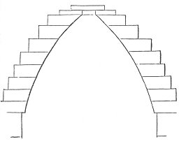 "Etruscan vaults are of two kinds. The more curious and probably the most ancient are false arches, formed of horizontal courses of stone, each a little overlapping the other, and carried on until the aperture at the top could be closed by a single superincumbent slab. Such is the construction of the Regulini-Galassi vault, at Cervetere, the ancient Cære." (Rawlinson's "Origin of Nations," p. 117.)