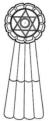 On the outside of this third circle are 12 scallops. Falling from the outside of the scallops is a ribbon which has 8 divisions.