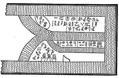 Fig. 3. All of the four pillars are found showing. This Egyptian Vignette shows one phase only of the destruction of Mu, how she sank into the fiery depths, The Nootka Indian shows the other phase, her burial by water. Arizona also supplies data on Mu's destruction by the symbolic pictures, pecked on her stones by the men of past ages. The American records are hoary with age.