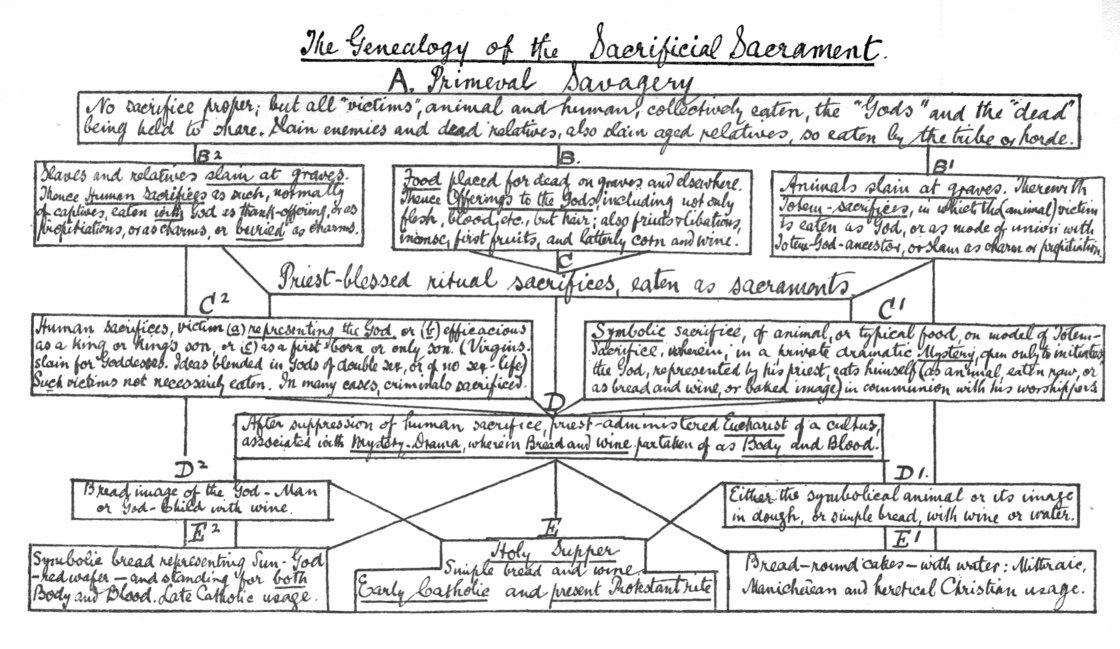 Meantime it may be helpful to draw up a tentative genealogical scheme of the history of the sacrificial idea as we have sketched it up to Christianity, and further to reduce this to diagram form. We set out with the dim primeval life in which