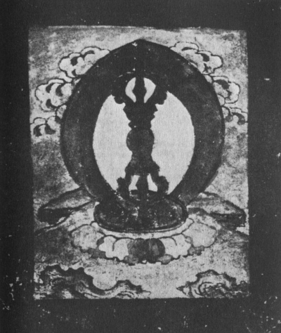 This Gtor-ma itself is identical with Buddha Vajrapani, the Master of the Esoteric Teachings. From it emanate infinite beams of light shining upon Buddha's Pure Lands in the ten directions, attracting hundreds of thousands of Buddha Vajrapanis, large and small, from the Aog-min Heaven and also from the north side of Mount Sumeru, together with infinite Garlands of Mantra and five-spoked thunderbolts to come down here. They all enter into your