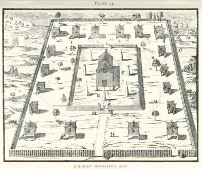 A modern Buddhist monastery consists of a quadrangle with a line of separate huts along each side just like the "huts lightly built" of Philo. Each hut is tenanted by a monk and his two servant pupils. Each hut has guest chambers, for two or more guests. The huts in Asoka's time, and also in modern times when the community migrates to the jungle for the Varsha or Lent, were called pansils, and have simply a covering of boughs and leaves, and perhaps mud walls, that as in the days of Job, thieves can "dig into." In the centre of the quadrangle is the sanctuary, a larger building whither the monks resort for worship. Nocturnal worship was a prominent feature with Asoka's monks, and with the Therapeuts and Christians.