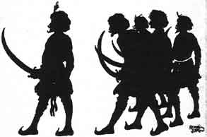 Then the thrifty merchant had his wagons drawn up in a circle. In the middle of the circle he had the oxen lie down, and also some of the men. He himself with the head men stood on guard, swords in hand and waited for the demons. But the demons did not bother them. Early the next day the thrifty merchant took the best of the wagons left by the foolish merchant and went on safely to the city across the desert.