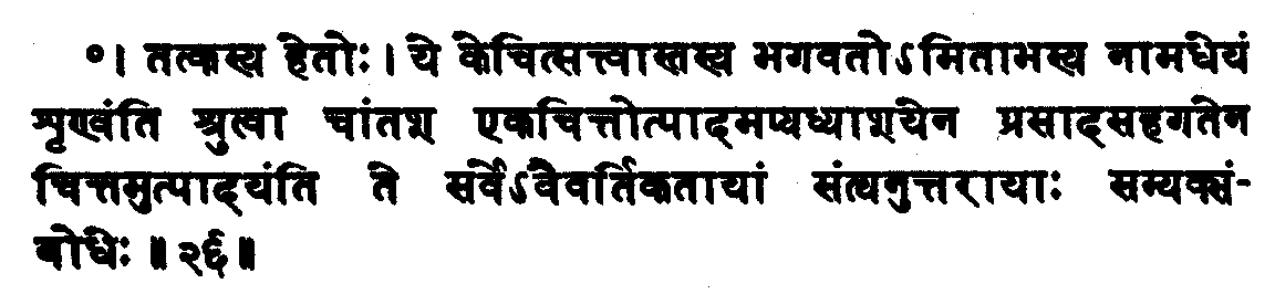 The fulfilment of this Pranidhâna may be the 27th chapter in the text, with the exception of some portion on the appearance of Amitâbha before a dying man, which belongs to the 19th (i.e. 18th in the text) Pranidhâna.