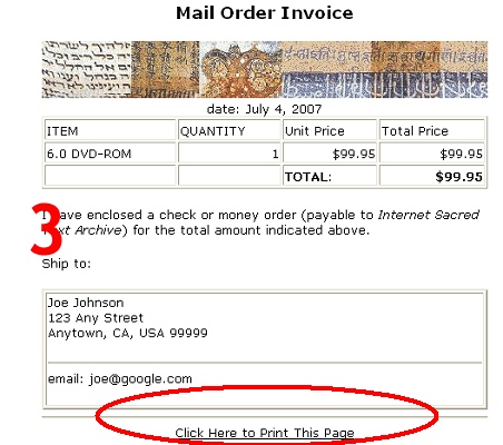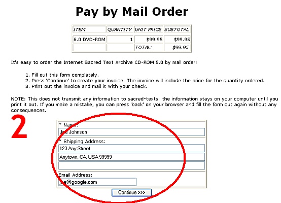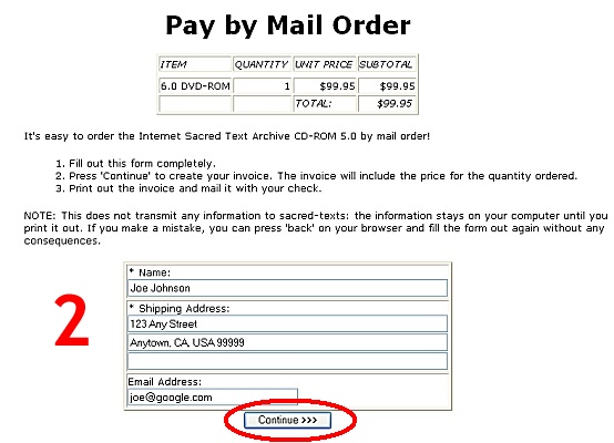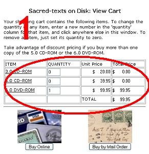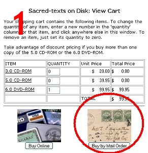 Sacred-texts on Disk: Buy by Mail OrderIf you don't want to buy the disk online, use the shopping cart and place a mail order. This does not transfer any information over the internet. Simply fill in what you want to buy, press a button, and your invoice will be displayed in your browser with complete shipping information and the total price of your order. Print it out and send it in using postal mail, along with your payment. We accept checks, money orders and cash. If you specify an email, you will get an emailed receipt the day we ship the product. HOW TO PLACE A MAIL ORDER It's as simple as 1, 2, 3: 2. Fill out your shipping info. 3. Print out and mail your invoice with payment.